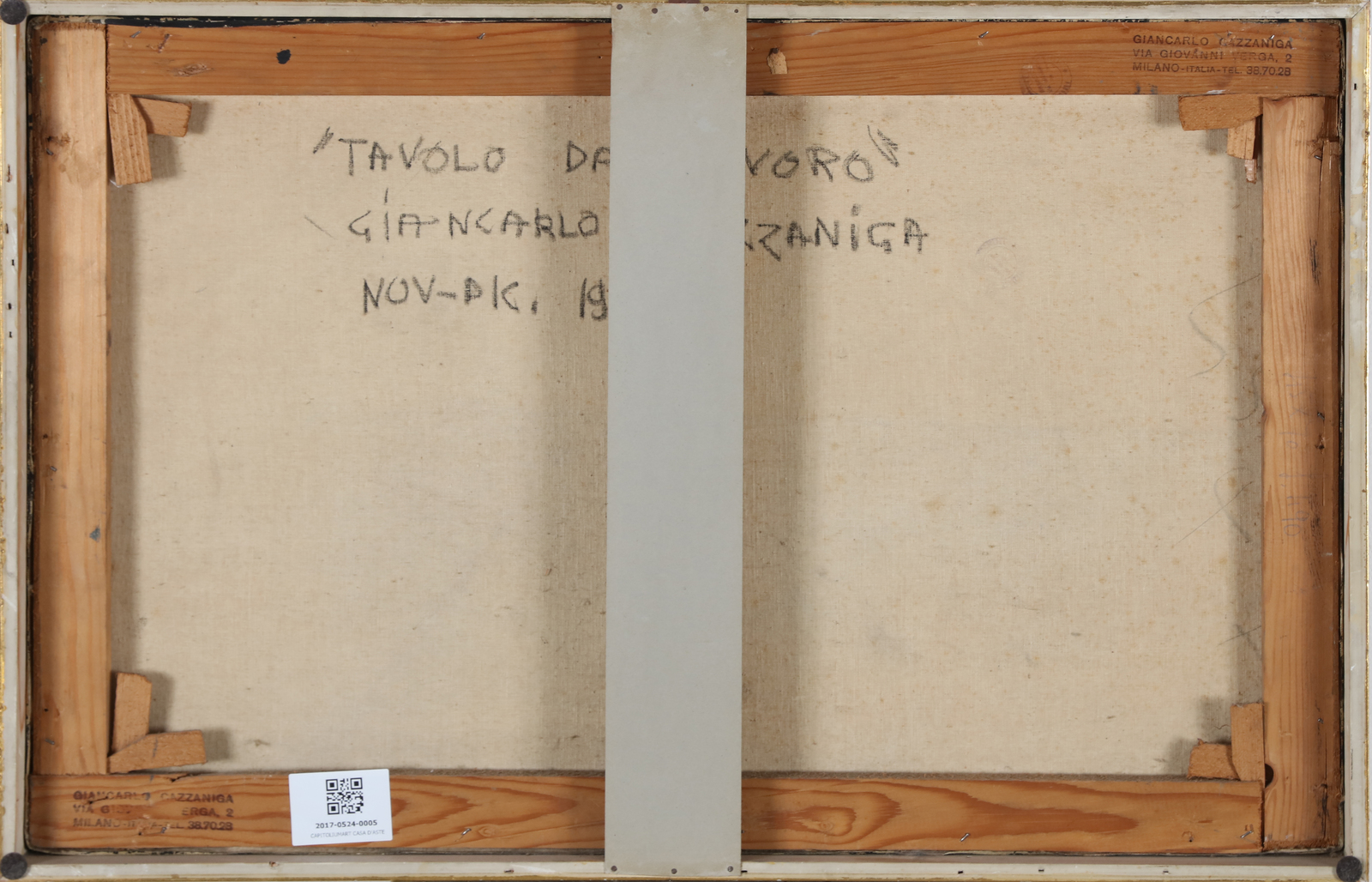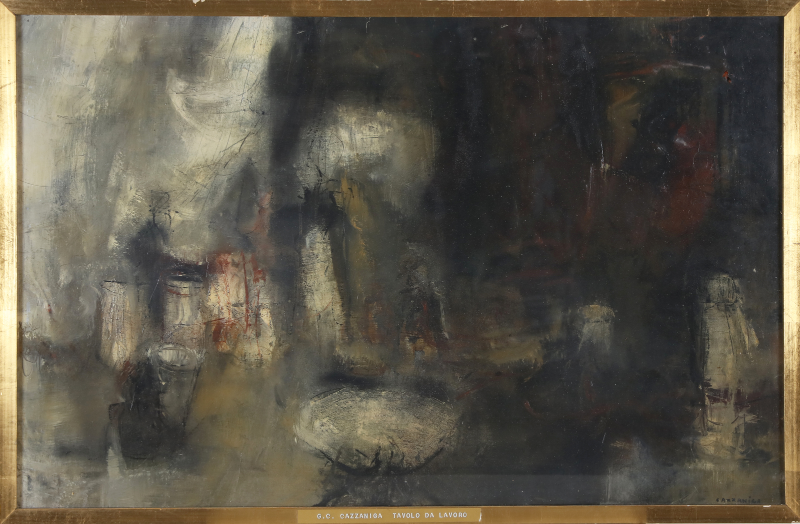 CAZZANIGA GIANCARLO (1930 - 2013) Tavolo da lavoro. 1960. Olio su tela . Cm 70,00 x 46,50. Firma in basso a destra. Al retro titolo, firma e anno. Cornice presente