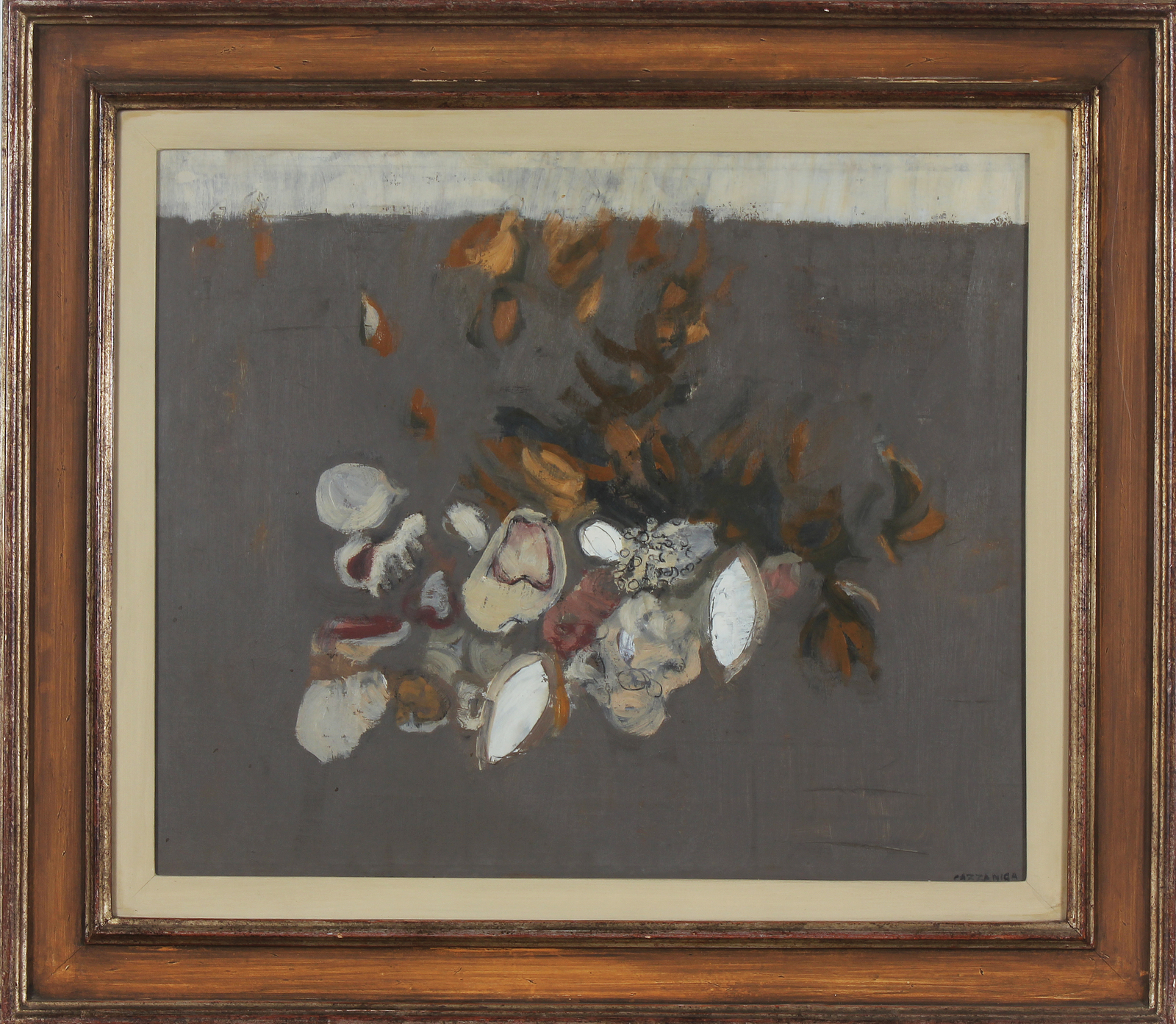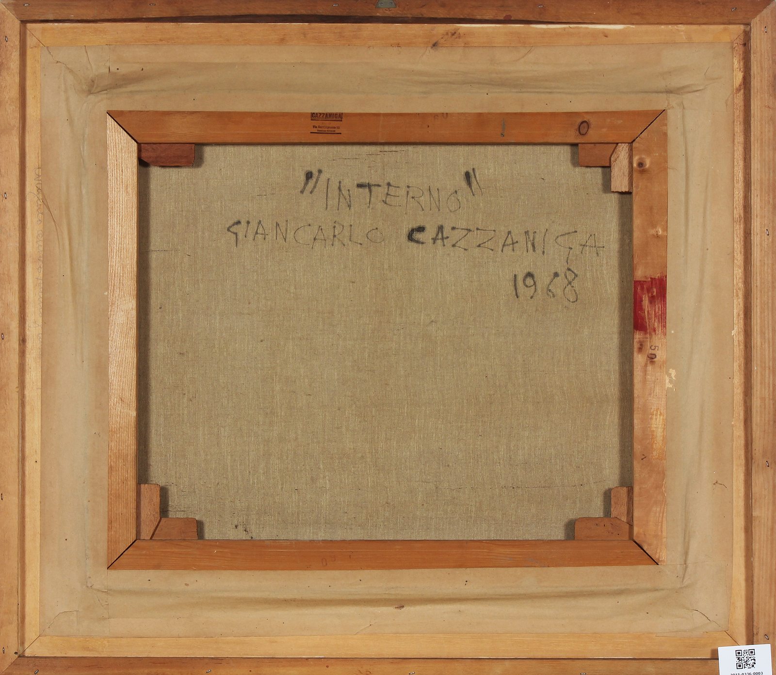CAZZANIGA GIANCARLO (1930 - 2013) Interno. 1968. Olio su tela . Cm 60,00 x 51,00. Firma in basso a destra. Al retro titolo, firma e anno. Cornice presente