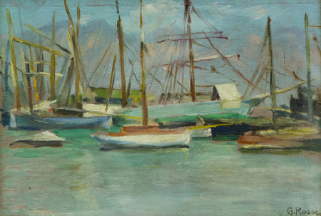 Giuseppe Rossi Firenze 1876 - Padova 1952 Barche in Versilia Olio su tavola, cm. 17,5x26 Firmato in basso a destra. Sul verso: dedica a persona con firma, titolo e cenni di provenienza.