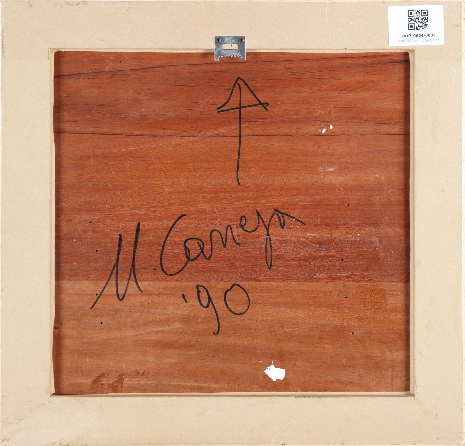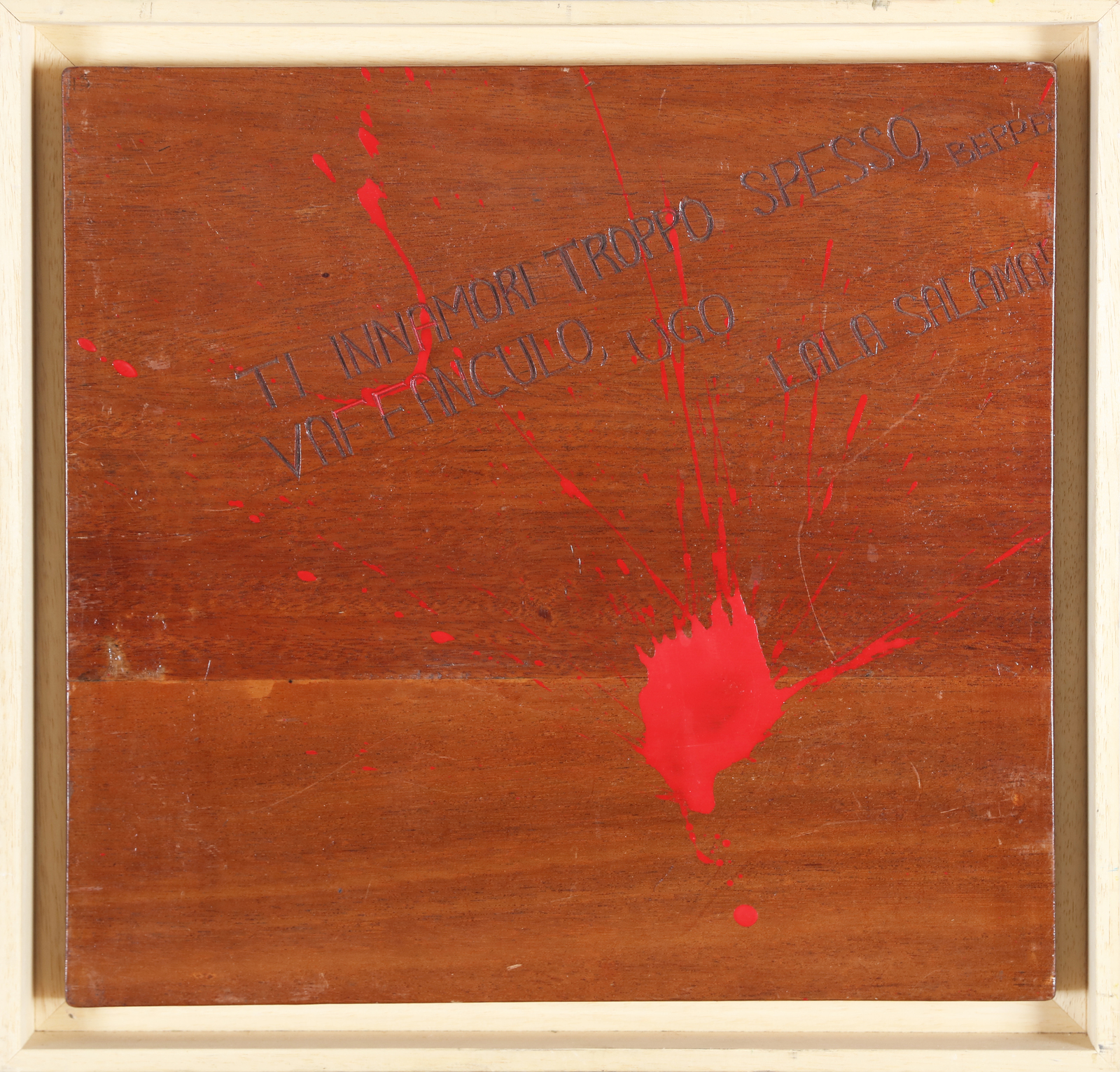 CARREGA UGO (n. 1935) Ti innamori troppo spesso Beppe. Vaffanculo, Ugo. Lala salama!. 1990. Tecnica mista su tavola. Cm 39,50 x 39,50. Al retro firma e anno. Cornice presente