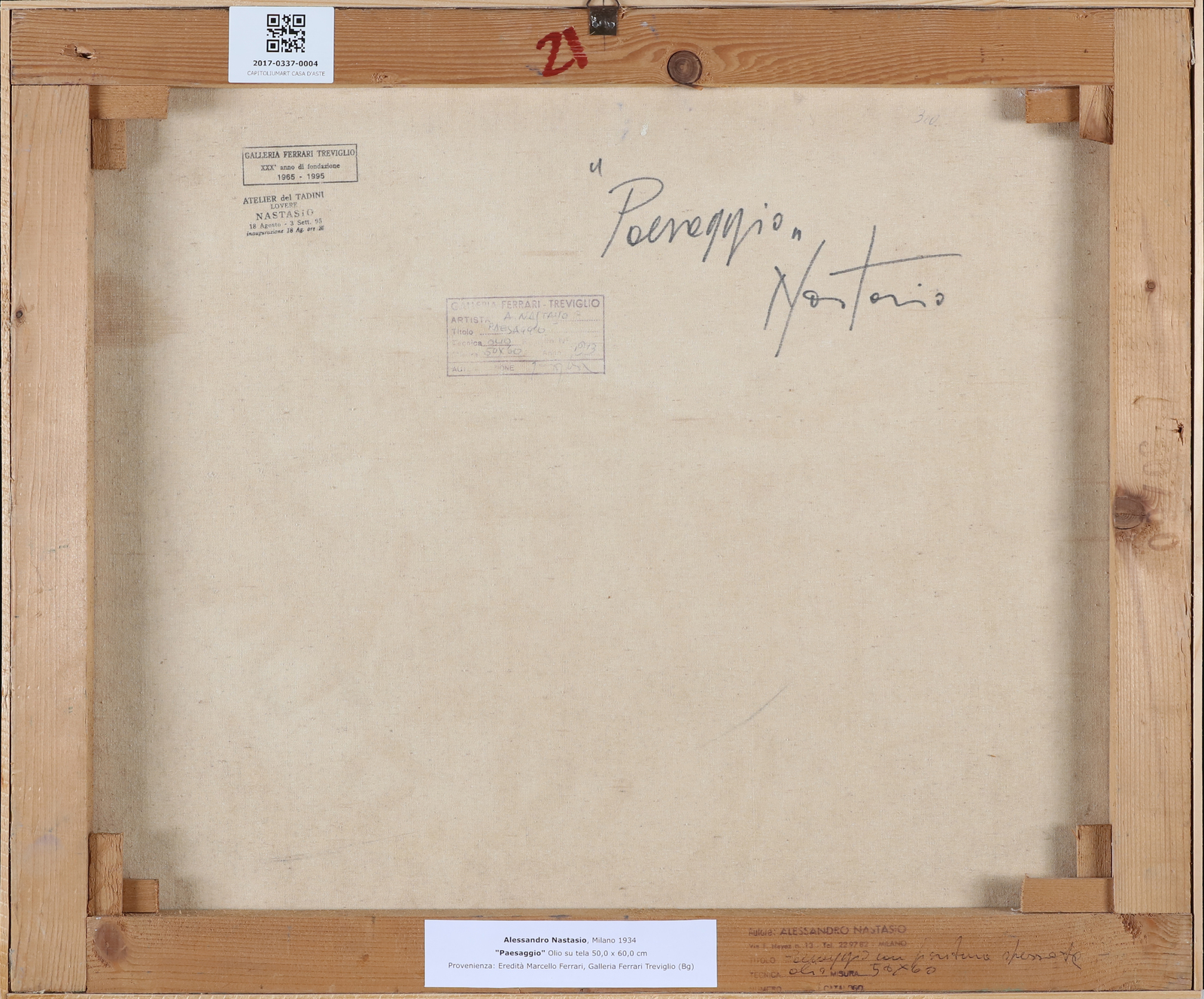 NASTASIO ALESSANDRO (n. 1934) Paesaggio. Olio su tela . Cm 60,00 x 50,00. Al retro firma, titolo e timbro della Galleria Ferrari, Treviglio. Provenienza: Eredità Marcello Ferrari, Galleria Ferrari, Treviglio.