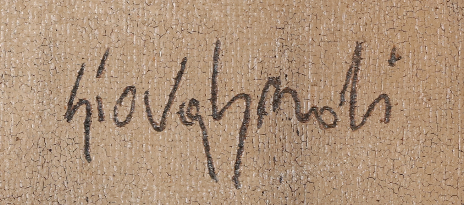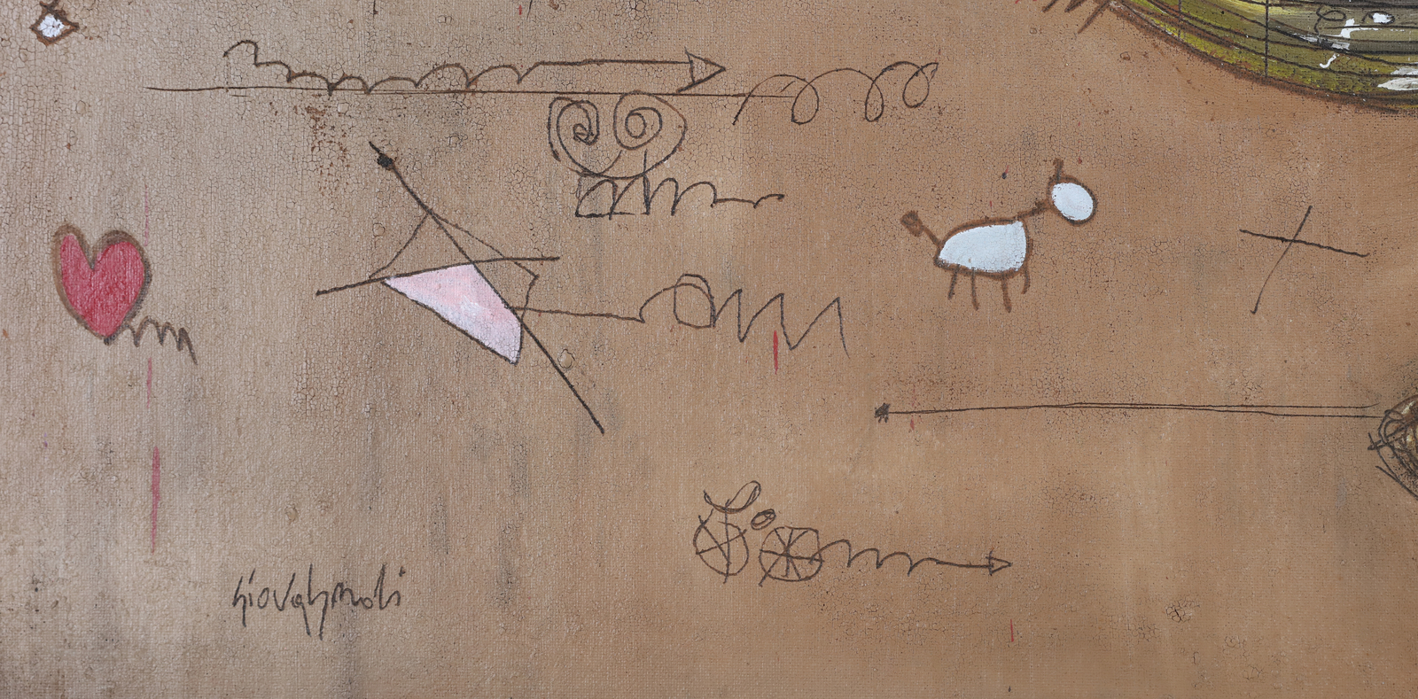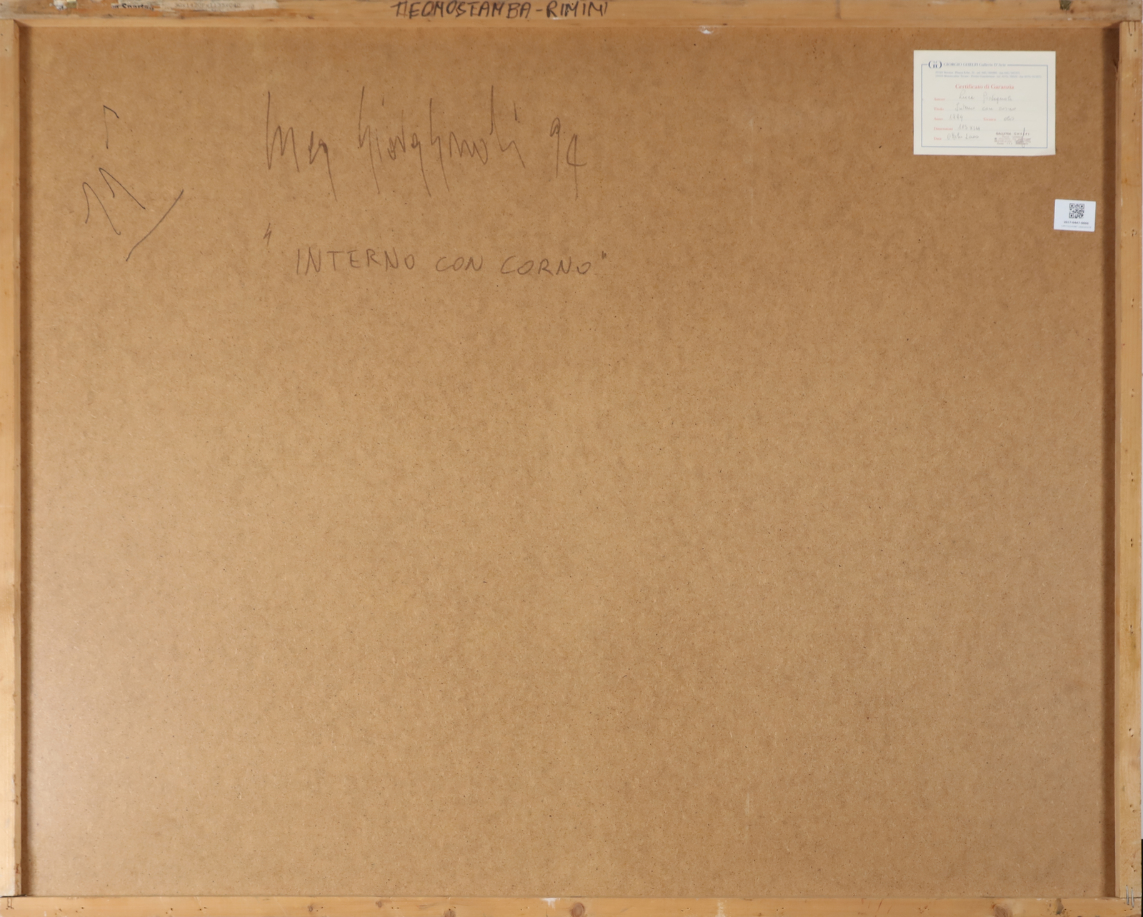 GIOVAGNOLI LUCA (n. 1963) Interno con corno. 1994. Olio su faesite rovesciata. Cm 150,00 x 120,00. Firma in basso a sinistra. Al retro firma, titolo, anno e certificato di garanzia Galleria D'Arte Giorgio Ghelfi, Montecatini Terme.