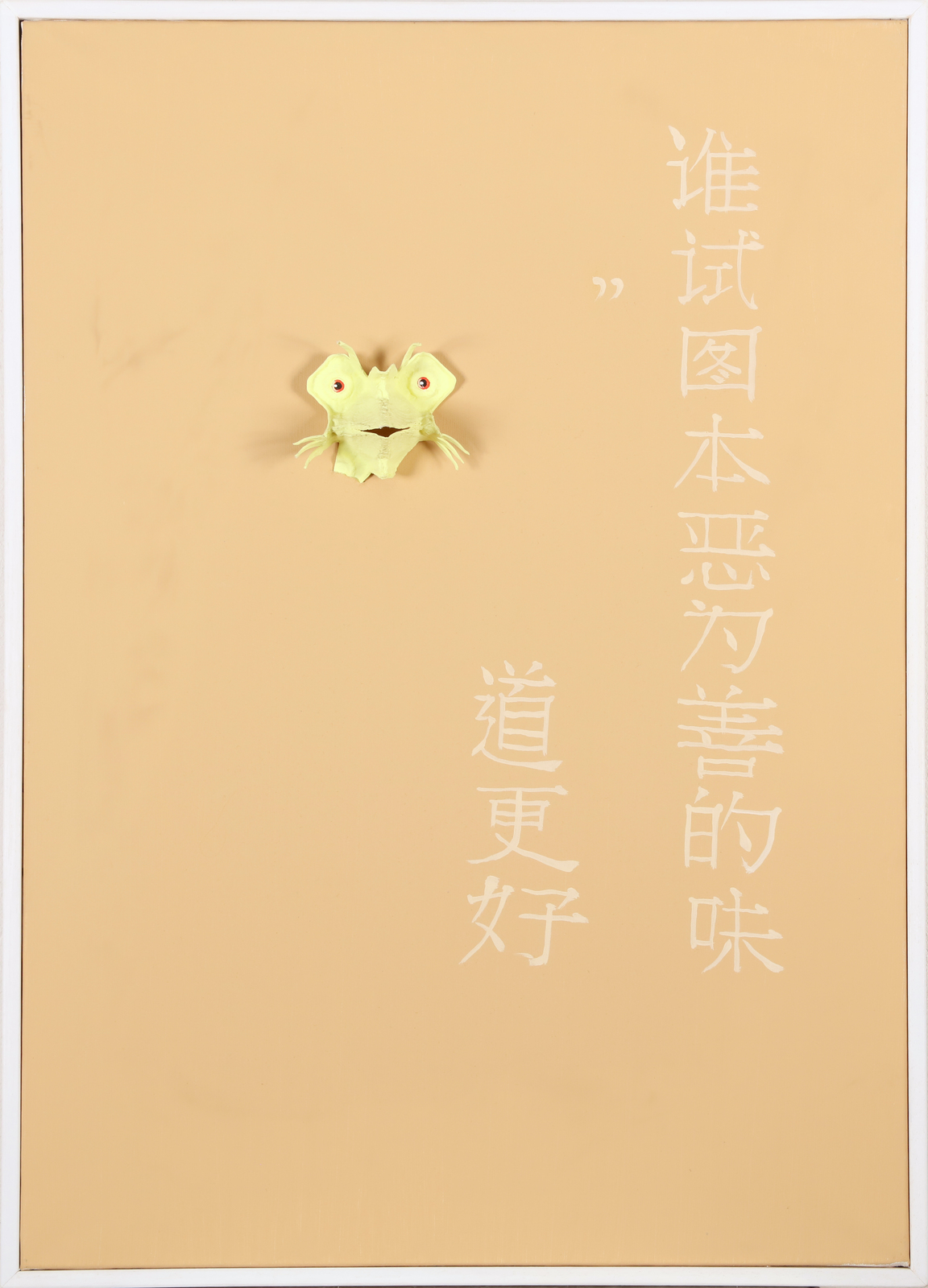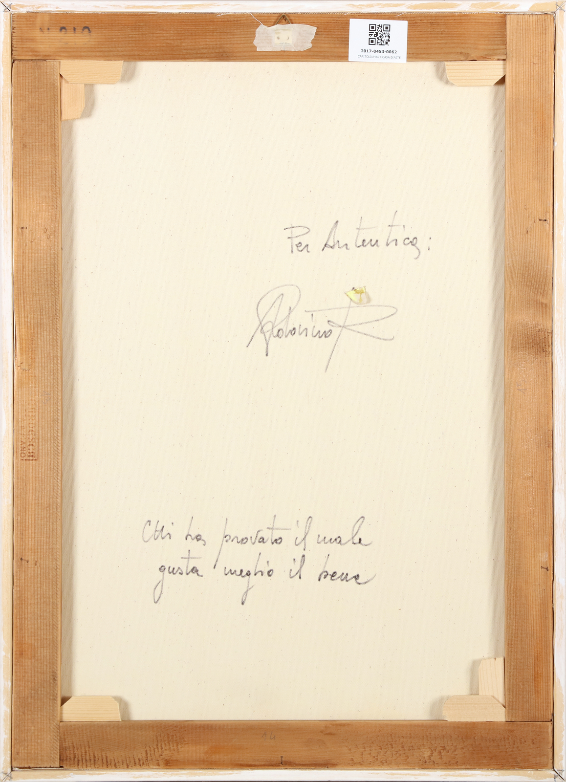 ARDOVINO ROBERTO (n. 1952) Chi ha provato il male gusta meglio il bene. Dalla serie Animali fantastici parlanti. . Tecnica mista e applicazioni su tela. Cm 50,00 x 70,00. Al retro firma per autentica e titolo. Autentica dell'artista su fotografia.