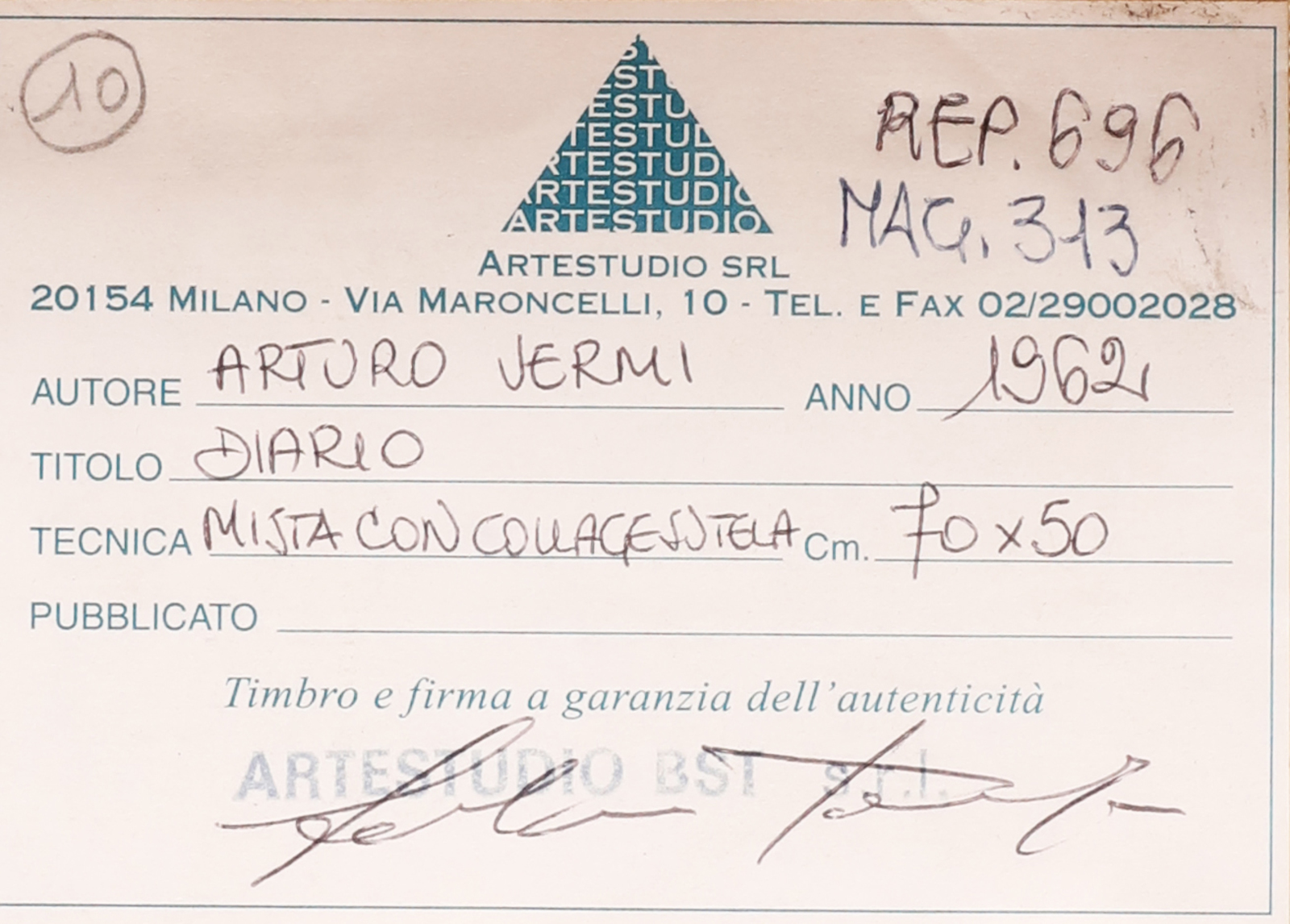 VERMI ARTURO (1928 - 1988) Particolari. 1962. Tecnica mista su tela. Cm 50,00 x 70,00. Firma e anno in basso a destra. Al retro firma e dedica. Cartiglio descrittivo della Galleria Artestudio, Milano. Opera archiviata presso l'Archivio Arturo Vermi, Seregno come da documentazione fotografica allegata all'opera riportante il relativo numero d'inventario.