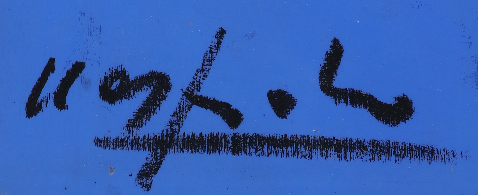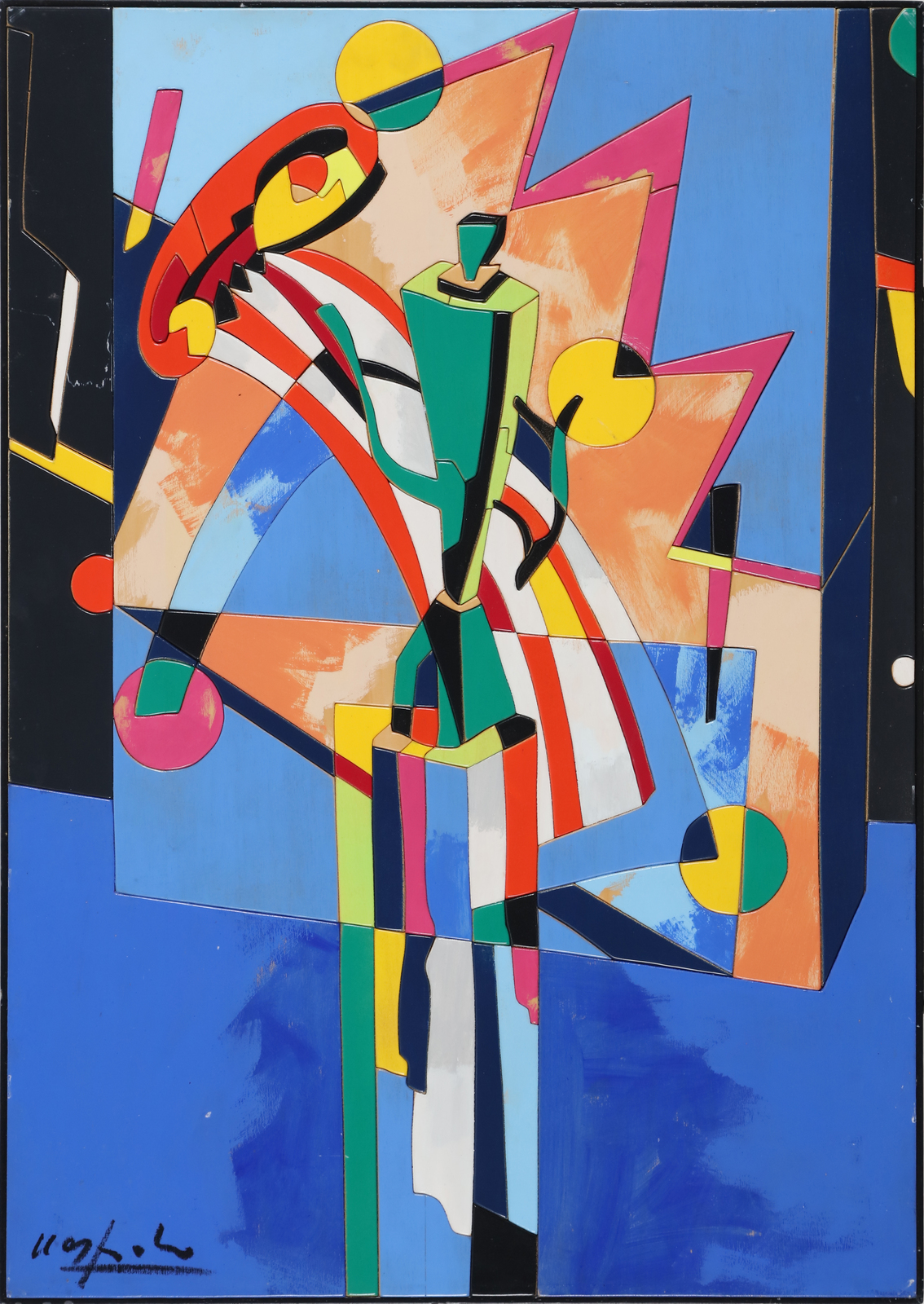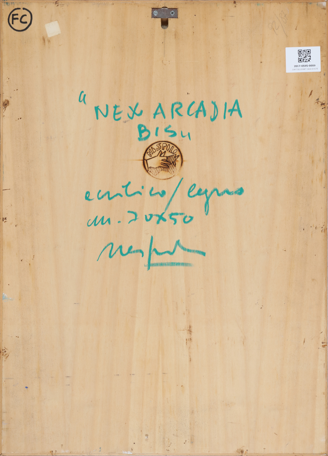 NESPOLO UGO (n. 1941) New Arcadia Bis. Acrilico su tavola. Cm 50,00 x 70,00. Firma in basso a sinistra. Al retro titolo, firma e timbro dell'artista. Presenti piccole mancanze di colore.