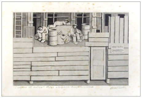 ALBERICO MORENA Gubbio 1926 L’ingresso nel cantiere 1973 Xilografia stampata a mano es.15/40 su carta velina. Firma in b. a d., titolo in b. a s.; altra firma sulla lastra in b. a d. (38 x 50 foglio – 19,8 x 31,5 inc.) Pubbl.: “Morena Opera Grafica 1954 – 1977” catalogo a cura di Guido e Giorgio Guastalla, Edizioni Graphis Arte, Livorno, 1977, p.60, n.58. B.A. 50
