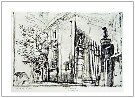 WALTER PIACESI Ascoli Piceno 1929 Foresteria della Villa Olivia in lucchesia 1977 Acquaforte es.86/150. Firma in b. a s.; firma, data e scritto dell’artista sulla lastra in a. a s. (50 x 70 foglio – 19,5 x 28 inc.) B.A. 50