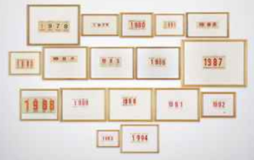 Alighiero Boetti (1940-1994) Calendari (ii) firma e iscrizione alighiero e boetti a mariangela per nuove speranze (sul fronte) (iii) firma e iscrizione a mariangela alighiero e boetti (sul fronte) (iv) firma e iscrizione a mariangela alighiero e boetti (sul fronte) (v) firma e iscrizione A MARIANGELA alighiero e boetti (sul fronte) (vi) firma e iscrizione alighiero e boetti a mariangela (sul fronte) (vii) firma e iscrizione a mariangela alighiero (sul fronte) (viii) firma e iscrizione alighiero e boetti (sul fronte) (ix) firma e iscrizione alighiero e boetti per mariangela (sul fronte) (x) firma e iscrizione A MARIANGELA ALIGHIERO alighiero e boetti (sul fronte) (xii) firma e iscrizione alighiero per mariangela (sul fronte) (xiii) firma e iscrizione alighiero per mariangela (sul fronte) (xiv) firma e iscrizione per mariangela alighiero (sul fronte) (xv) firma e iscrizione per mariangela alighiero (sul fronte) (xvi) firma e iscrizione PER MARIANGELA alighiero e boetti (sul fronte) (xvii) firma e iscrizione alighiero e boetti per mariangela (sul fronte) collage di fogli di calendario su carta, 17 elementi i) cm 30 x 40 ii) cm 16 x 29.3 iii) cm 17.5 x 25 iv) cm 16.3 x 23 v) cm 18.7 x 33.4 vi) cm 17.4 x 25.2 vii) cm 25 x 35 viii) cm 25 x 35 ix) cm 25 x 35 x) cm 35 x 50c xi) cm 24.2 x 30 xii) 24.6 x 35 xiii) 25 x 35 xiv) 25 x 34.8 xv) 17.5 x 24.8 xvi) 12.5 x 17.5 xvii) 21 x 29.2 Eseguito nel 1978-1994 Opera registrata presso l'Archivio Alighiero Boetti, Milano, n. 511, come da autentica su fotografia in data 25 febbraio 2005