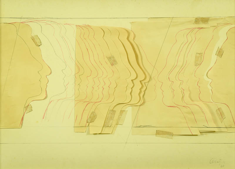 Mario Ceroli (Castelfrentano (Ch) 1938 ) Profili, 1968 Collage e tecnica mista su cartone, cm. 50x71. Firma e data in basso a destra. Autentica dell'Artista su foto, con timbro Galleria Meta, Firenze.