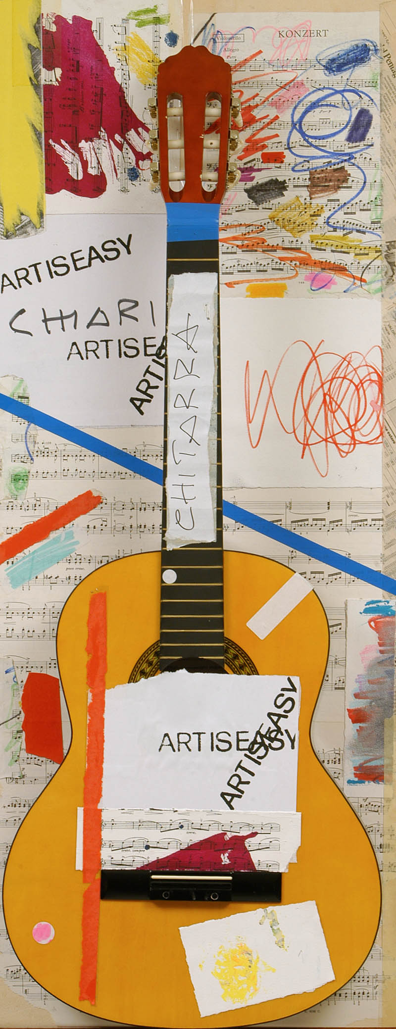Giuseppe Chiari (Firenze 1926 2007) Art is easy, anni 2000 Assemblaggio con chitarra e tecnica mista su tavola, cm. 105x41x11, in teca di plexiglas. Firmato al centro. Pubblicato su "Giuseppe Chiari, Musica e segno ", ediz. Gli Ori - Armanda Gori Arte, disp. 2-3, a colori pag. 264. Autentica dell'Archivio "Giuseppe e Victoria Chiari" a cura del figlio Mario Chiari, su foto con timbro a secco e Archivio n° 2245.