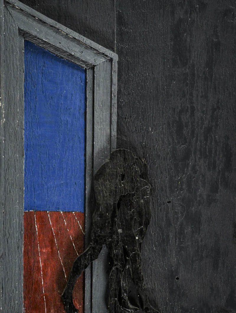 Mario Ceroli (Castelfrentano (Ch) 1938 ) La cacciata, Scultura in gesso dipinto, cm. 42x32x9, pezzo unico. Firmato sul lato sinistro. Autentica dell'Artista su foto.