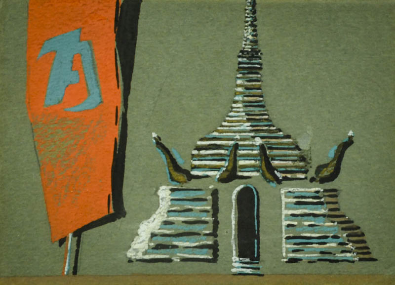 Enrico Prampolini (Modena 1894 Roma 1956) Abbozzo di scena per la Principessa delle Pagode di Ravel, 1944 Tempera su cartoncino, cm. 12,5x17,5. Sul verso: Etichetta con descrizione. Etichetta: "Galleria Fonte d'Abisso Edizioni", Modena con timbro e descrizione. Provenienza Pandolfini casa d'aste, Firenze.
