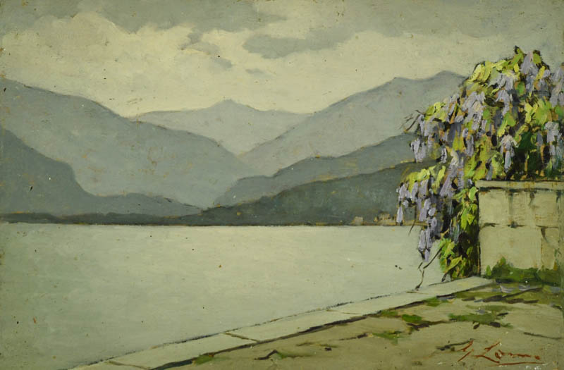 Giovanni Lomi (Livorno 1889 Livorno 1969) Glicine sul lago Maggiore, 1940 c.a. Olio su tavola, cm. 19,5x29 Firmato in basso a destra;. Sul verso: firma e titolo. Autentica di Massimo Lomi su foto con Archivio n° 474..