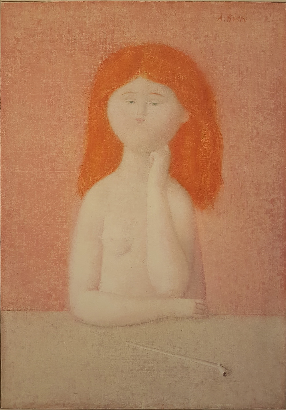 Antonio Bueno (Berlino 1918 Firenze 1984) Ragazza al tavolo nuda con pipa, anni '70 Olio su faesite, cm. 35x25. Firmato in alto a destra. Scritto di autenticità della figlia Isabella Bueno. Certificato di provenienza "Faustini Arte", FI.