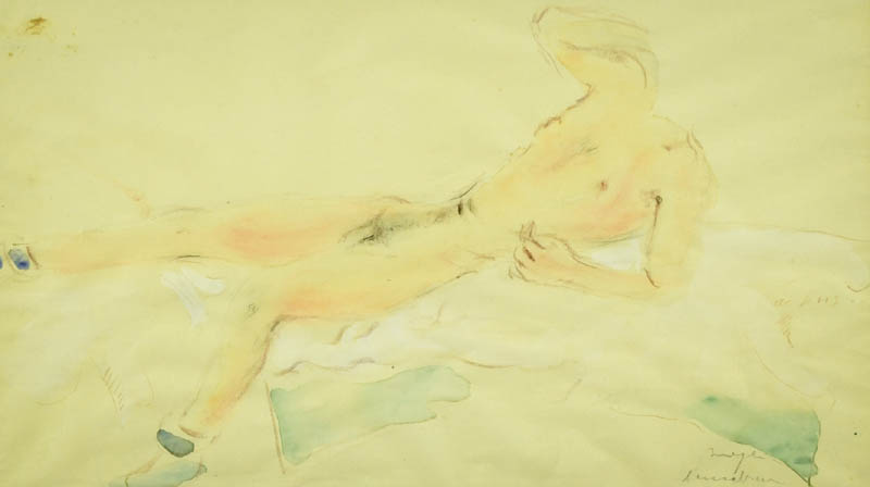 Filippo De Pisis (Ferrara 1896 Milano 1956) Nudo di giovane, Tecnica mista su carta, cm. 24x41 Firmato in basso a destra. Certificato di Provenienza "Saletta d'Arte Viviani", Pisa, su foto.