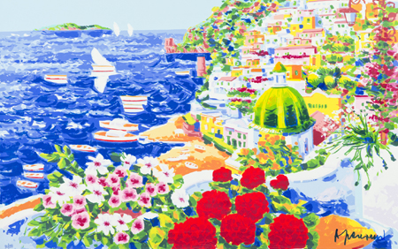 Athos Faccincani Peschiera del Garda (Vr) 1951 Racconto di primavera per una splendida Positano Serigrafia polimaterica su tela, cm. 54x84, es. 90/99 Firma in basso a destra, tiratura in basso a sinistra. Sul verso: timbro dell'Artista con firma e descrizione.