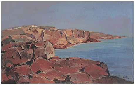 ANGIOLO VOLPE Livorno 1943 Sardegna, Calasetta, nido dei passeri 1972 Olio su cartone 50 x 80. Firma in b. a d.; su verso località, data, titolo e firma. B.A.: 100
