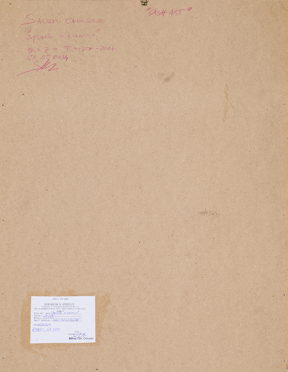 Firma, tecnica, misure, datazione, numero di archiviazione e dichiarazione di autenticità dell'Artista al retro