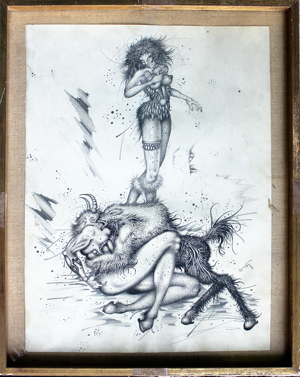 Antonio Cannata, "La sfida", tecnica mista, china e matita su carta, cm 48x36, firma in basso a destra