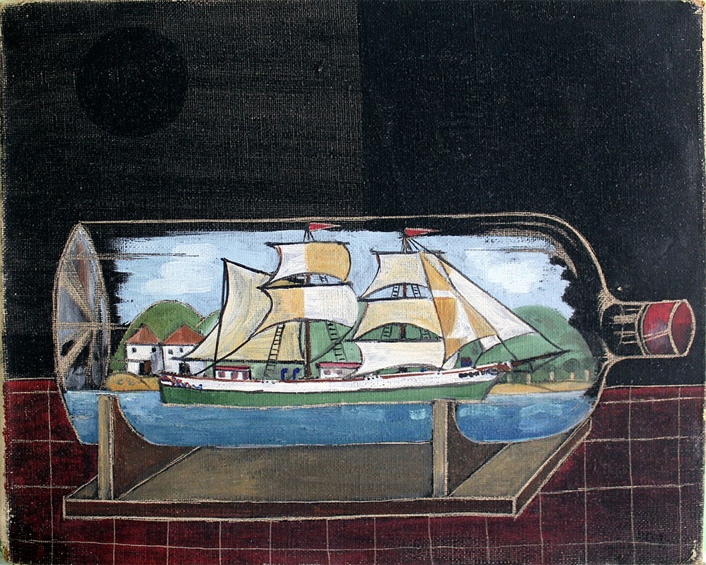 Edward Alcoy, "Veliero in bottiglia", olio su tela cm 22x27, firma al retro, timbro Galleria di Barcellona