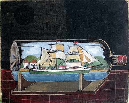 Edward Alcoy, "Veliero in bottiglia", olio su tela cm 22x27, firma al retro,...