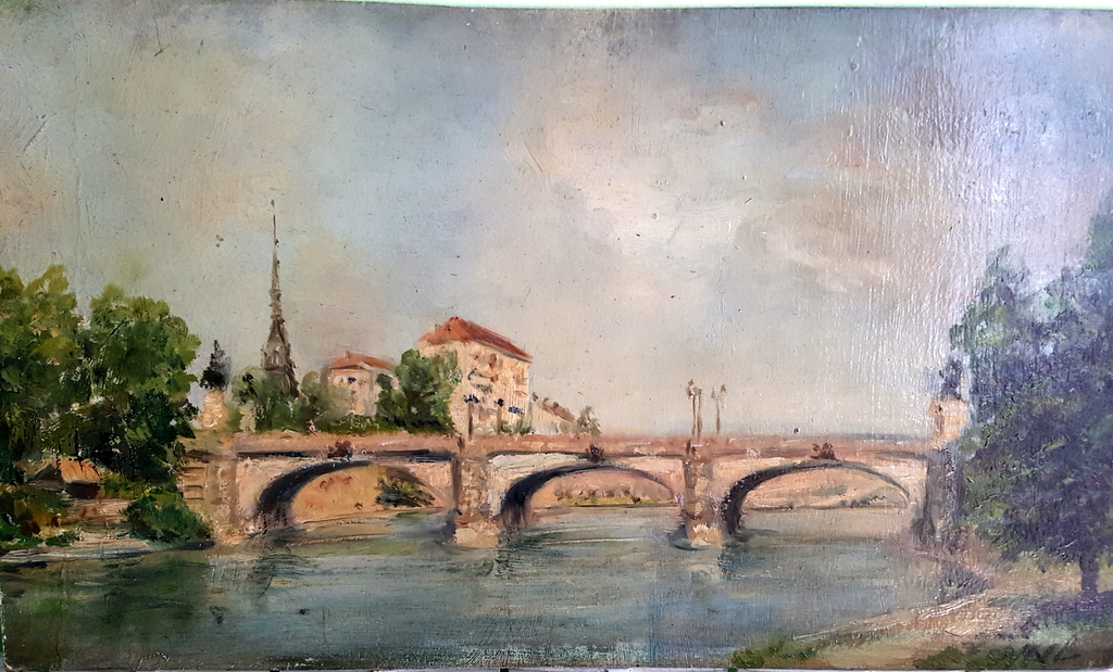 Anonimo, "Ponte Torino", olio su tavola cm 38x22, firma indecifrabile in basso a destra (J. Novellis)
