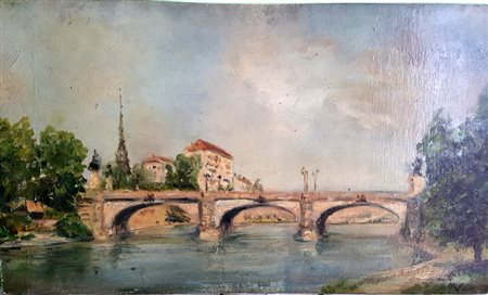 Anonimo, "Ponte Torino", olio su tavola cm 38x22, firma indecifrabile in...