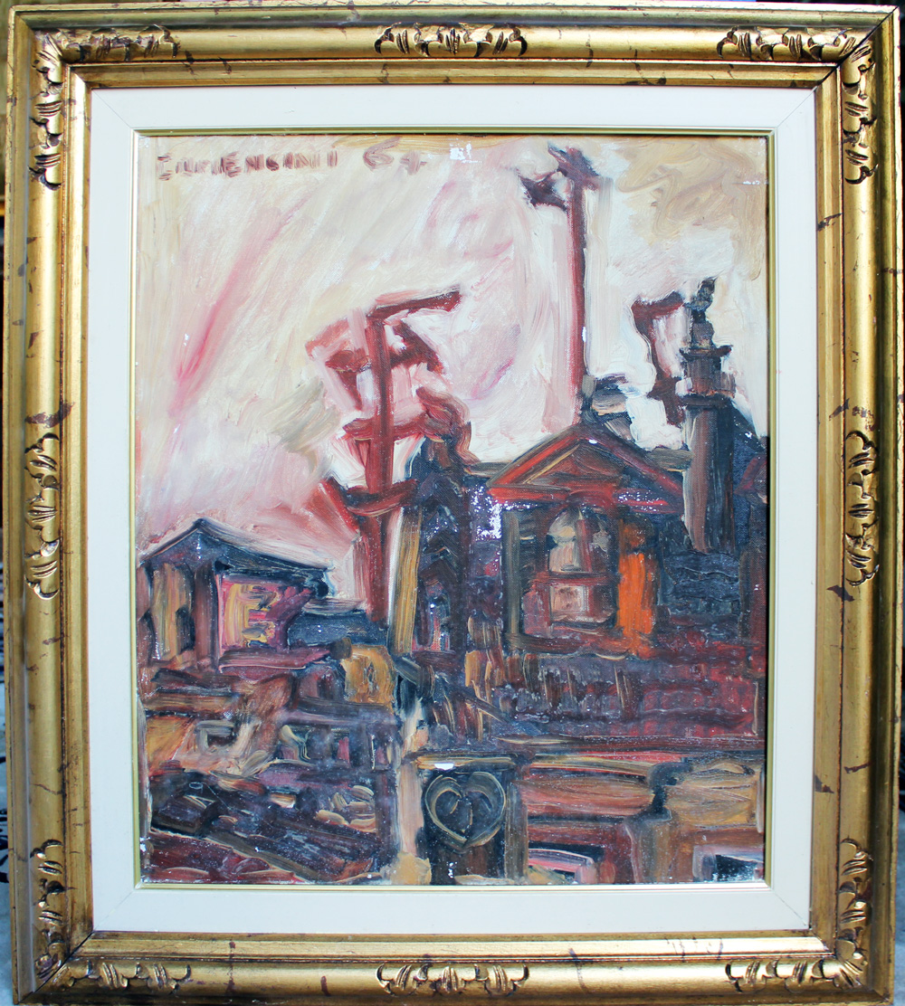Eugenio Comencini, "Tetti", 1964, olio su tela cm 60x50, firma in alto a sinistra