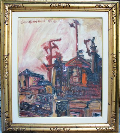 Eugenio Comencini, "Tetti", 1964, olio su tela cm 60x50, firma in alto a...