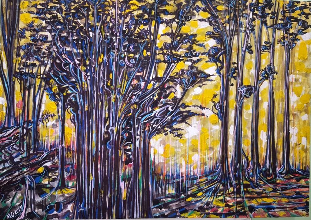 Massimo Costantini, "Bosco luminoso", 2017, acrilico su tela cm 50x70, firma e anno in basso a sinistra