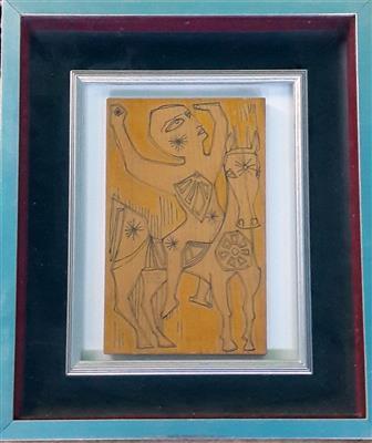Mario Molinari, "Cavaliere", pirografia su tavola cm 29x18, firma...