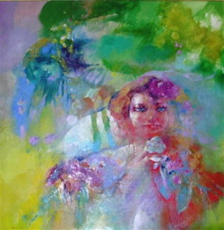 Vittorio Sodo, "Volti tra i fiori", olio su tela 100x100, firma in basso a sinistra, autentica su foto Galleria L'Alfiere Arte - Torino