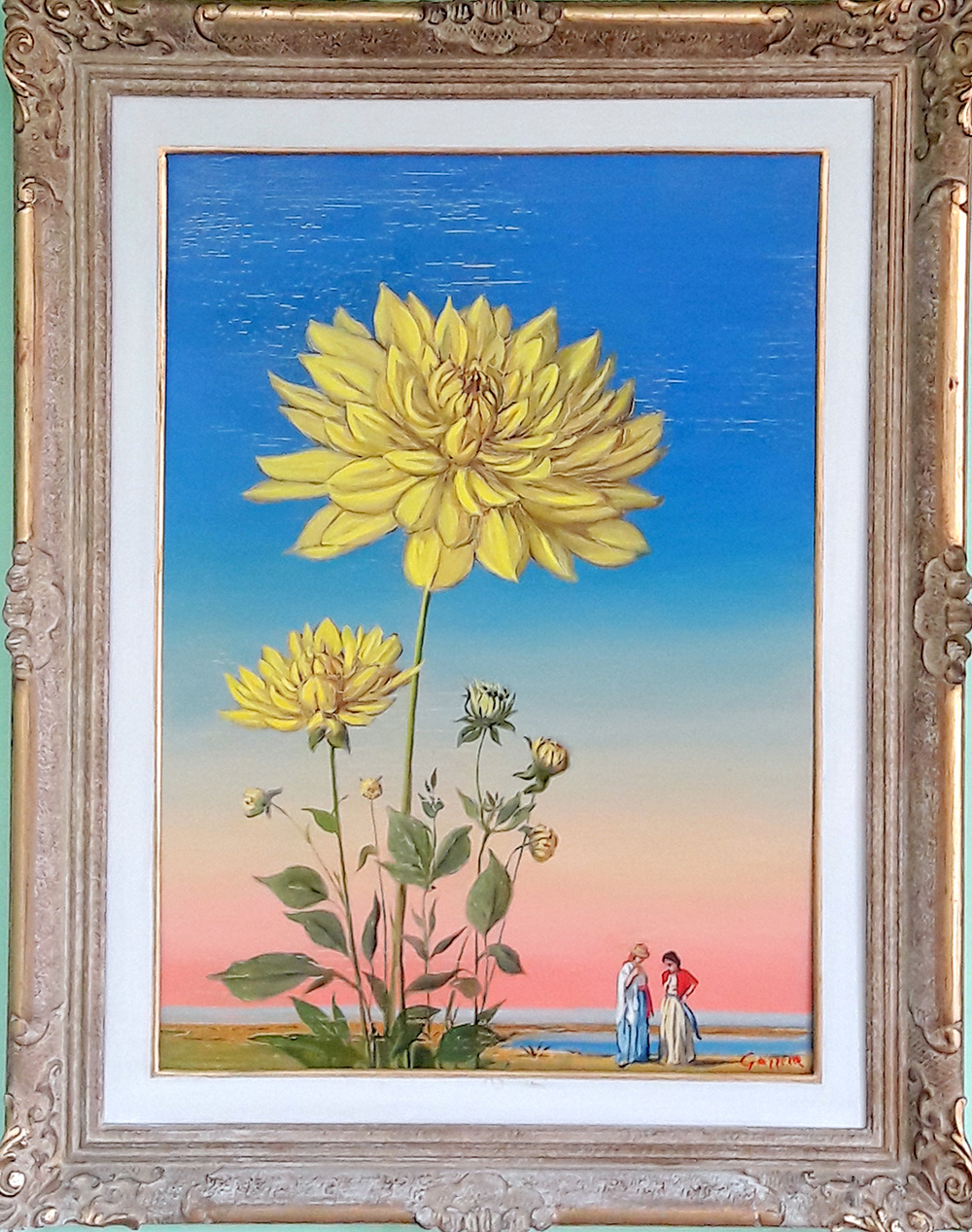 Romano Gazzera, "Dalia gialle", 1974, olio su tela cm 70x50, firma in basso a destra,titolo, firma e data al retro, autentica su foto Galleria L'Alfiere Arte - Torino