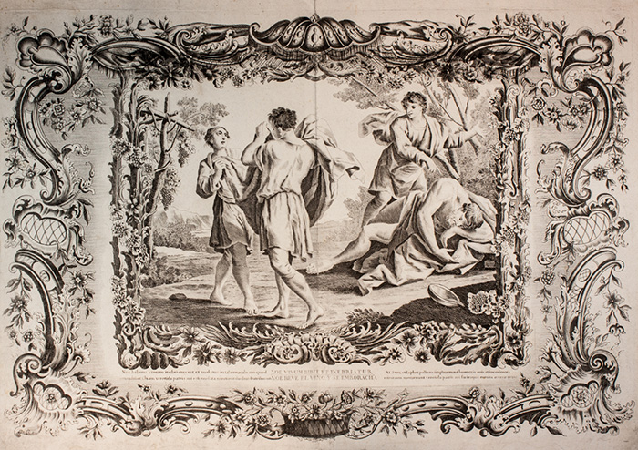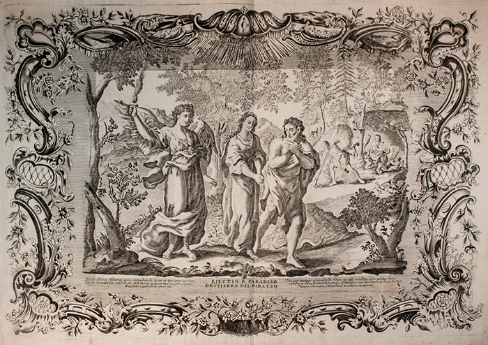 Bulino. 520/525x770. Foglio: 565x790/800. 1) Cacciata dall'Eden. 2) Ebbrezza di Noè. Titolate in basso al centro in latino ed in spagnolo. Belle impressioni su carta vergellata apparentemente priva di filigrana. (2)