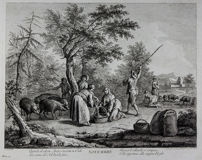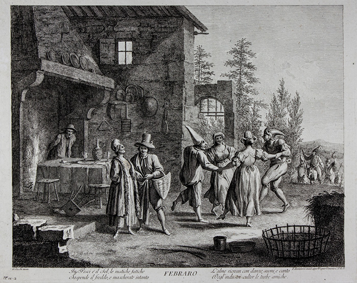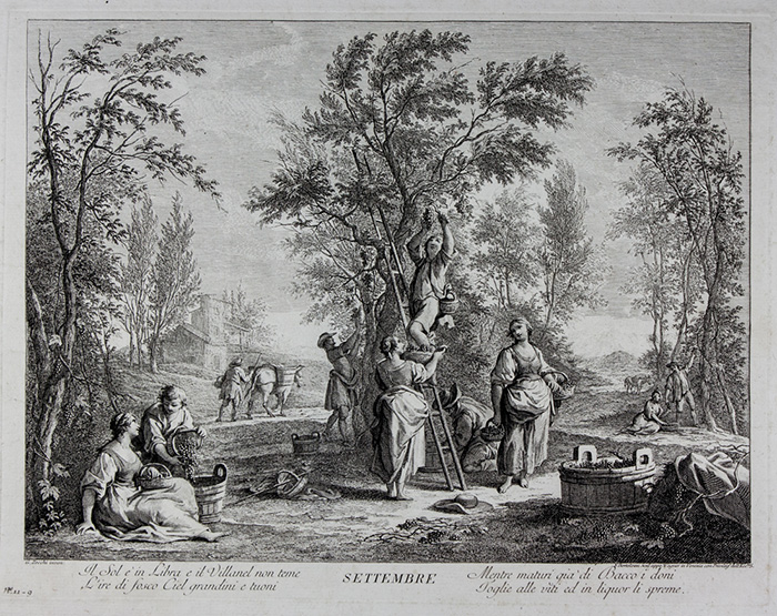 Acquaforte e bulino. mm 357x455/462. Fogli: 465x625. DeVesme/Calabi, 661 e sgg. Serie scompleta mancante dei mesi di Marzo, Maggio ed Ottobre. Bellissime impressioni di eccezionale freschezza, stampate su bella carta vergellata pesante con filigrana.  (9)