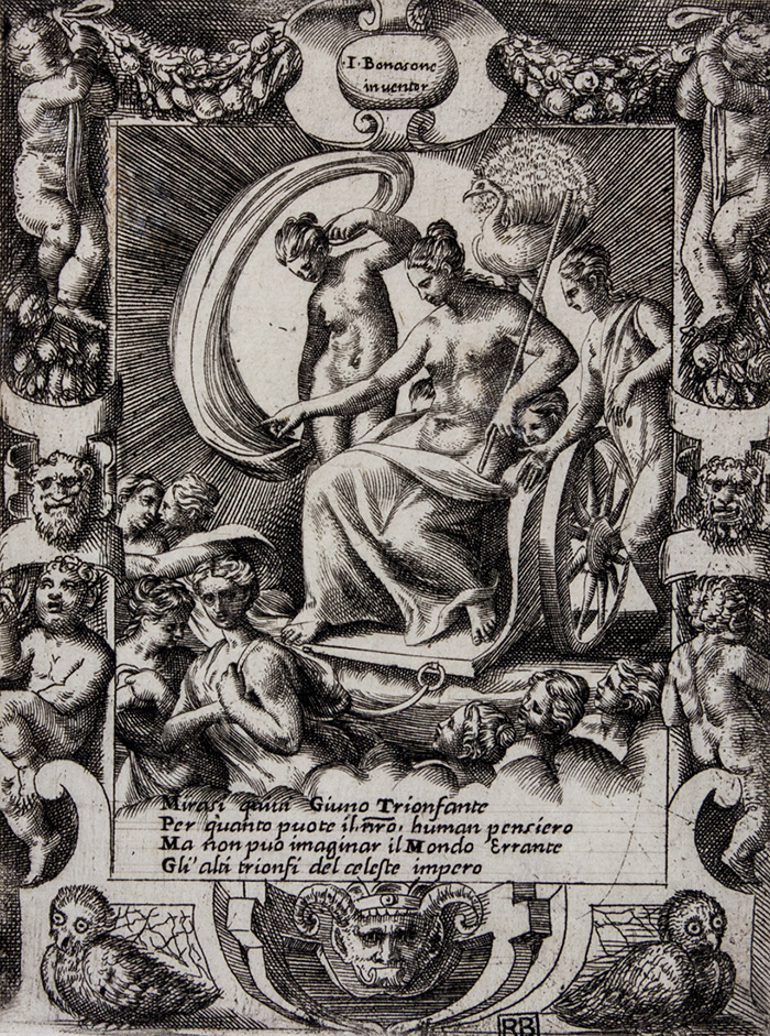 Acquaforte e bulino. mm 135x103. Bertelà/Ferrara, 71. Massari, 198. TIB 28 (Commentary), 117. In alto al centro "I. Bonasone/ inventor". Quarta tavola dalla serie in 22 fogli Amori sdegni et Gielosie di Giunone. Bellissima impressione prima del numero su carta vergellata con filigrana "ancora". In basso a destra timbro della collezione R. Bathurst (?) (Lugt, 2192).
