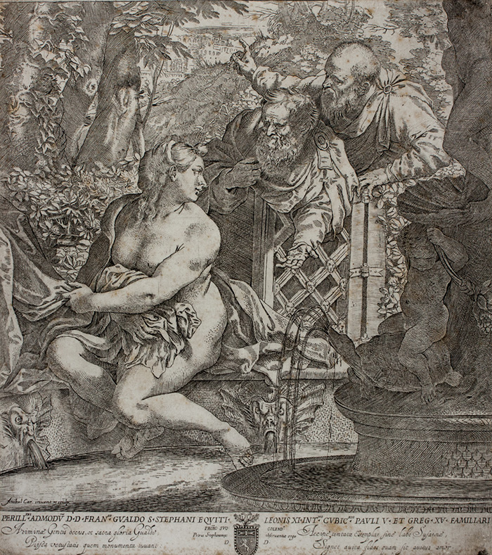 Acquaforte e bulino. mm 347x310. Bartsch, 180. DeGrazia, 14. Firmata nell'inciso in basso a sinistra, nel margine inferiore la dedica in latino a Francesco Gualdo e l'indirizzo dello stampatore Pietro Stefanoni "Petrus Stephanonius observatiae ergo". Buona prova nel III stato su 4 dopo la comparsa della firma.