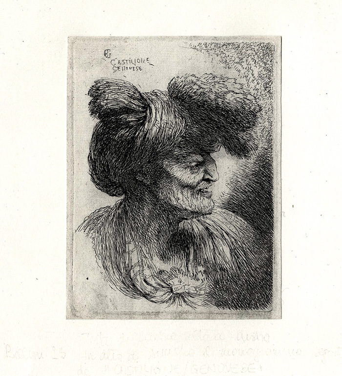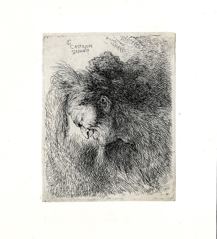 1) Testa di vecchia volta a destra. Acquaforte. mm 110x82. Foglio: mm 116x87. Bellini (Castiglione), 25. 2) Testa di vecchia volta a sinistra. Acquaforte. mm 105x82. Foglio: mm 108x85. Bellini (Castiglione), 29. (2)