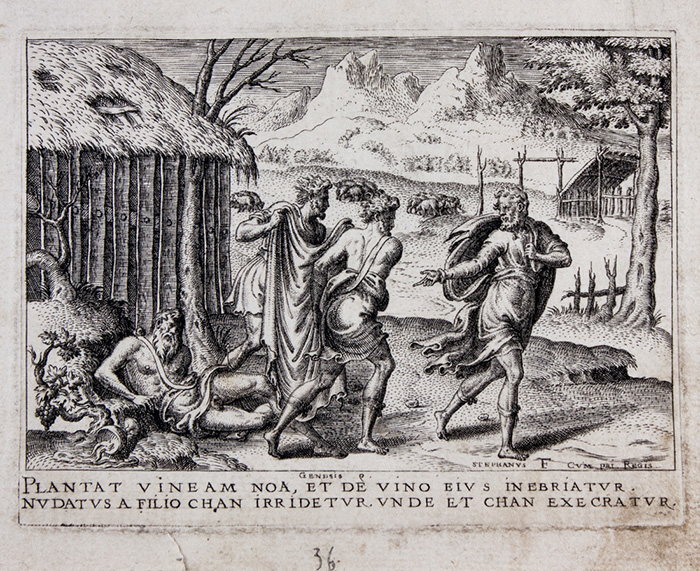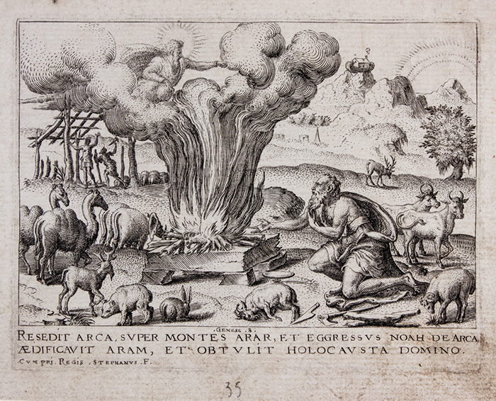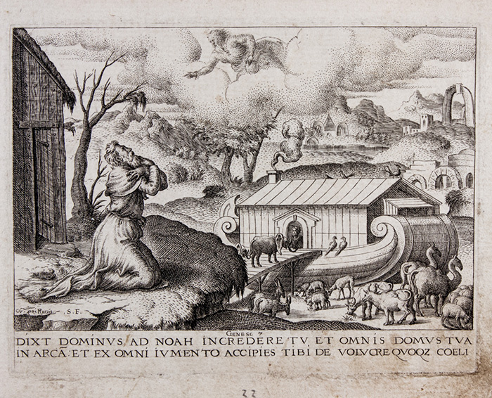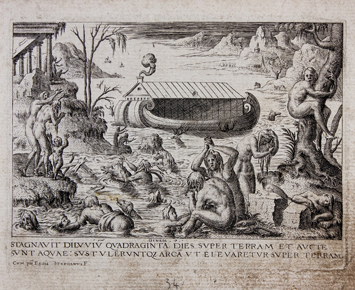 Quattro tavole raffiguranti la Storia di Noè (Dusmenil, 33-36) da La Genesi (Dusmenil, 24-59). 1) Dio ordina a Noè di entrare nell'arca. 2) Il grande diluvio. 3) Noè uscito dall'arca sacrifica al Signore. 4) Ebbrezza di Noè.  Bulino. mm 78/80x107. Foglio: 93/95x118/120. Bellissime prove nel I stato su 2 il foglio 1, e nell'unico stato le altre tre, su carta vergellata sottile priva di filigrana, (4)