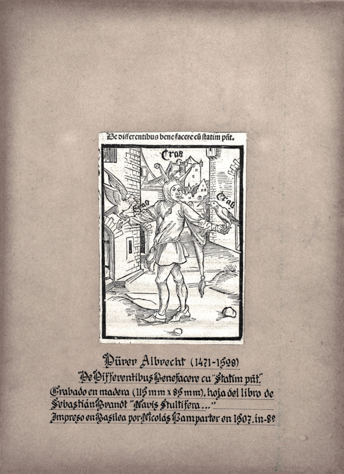 Xilografia. 116x85. Foglio: mm 185x130. Strauss, 13/c. Da Sebastian Brant (Strasburgo 1458 - 1521) Jodocus Badius Ascensius (Josse Badius Van Asche, Gand 1462 - Parigi 1535) Navis stultifera / a domino Sebastiano Brant primum edificata… Impressum Basilee per Nicolaum Lamparter, Anno. &c M.ccccc vii. Comparsa per la prima volta a Basilea nel 1494, in occasione del clamoroso Carnevale altorenano Das Narrenschiff (La nave dei folli) dell’umanista Sebastian Brant è un'opera satirica in tedesco alsaziano composta da una serie di 112 satire brevi, ed illustrata con xilografie, viene ricordata anche perché molte di esse furono eseguite da Albrecht Dürer, già attivo a Basilea negli anni precedenti. L’opera è un grottesco viaggio dei matti che, nella concezione di Brant, a cavallo tra tardo medioevo e rinascimento, sono tutt’uno con i peccatori, diretti verso il naufragio finale che precede la quaresima, metafora dell’eterna punizione. Il libro fu tradotto in latino da Jacob Locher (Stultifera navis) nel 1497, in francese da Paul Riviere nel 1497 e da Jehan Droyn nel 1498.