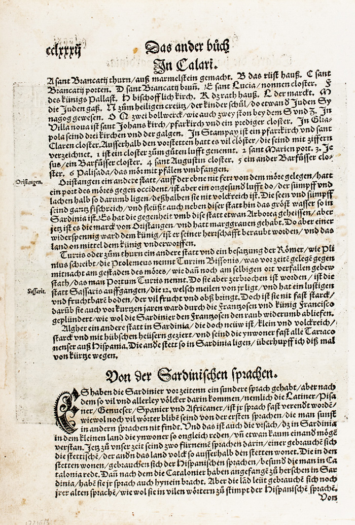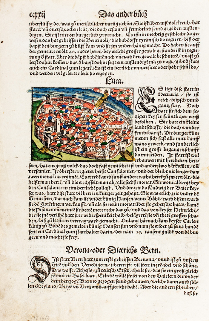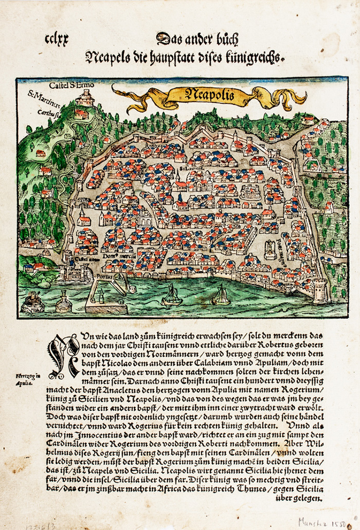 Xilografie in coloritura settecentesca. Fogli: mm 285x195 cad. Le pagine includono vedute di Cagliari (Calaris, die haupestatt in Sardinia) Napoli, Ferrara, Bologna e Lucca, oltre a stemmi, anch'essi in coloritura.Testo in tedesco. Provenienti dall'opera Cosmographia universalis (1550). (3)