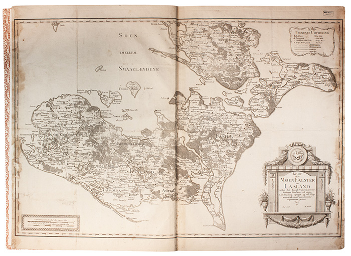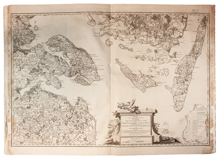 In-folio massimo (mm 643x450). Raccolta di 8 carte geografiche della Danimarca. 1) Kort over Moen Falster og Laaland; 2) Den Syd Ostlige Fierdedeel af Siaelland...; 3) Kort over Haureballegaards... Skanderborg... Silkeborg; 4) Den Sydvestlige Fierdedeel af Siaelland...; 5) Kort over Siaelland og Moen...; 6) Den Nord Vestigle frerdedeel Fierdedeel af Siaelland...; 7) Kort over Den Sydlige Deel af Fyen...; 8) KIøbenhavns Amt Efter Kongelig... Legatura ottocentesca in mezza tela lisa con piatti ricoperti in carta marmorizzata moderna. Ex-libris di antica appartenenza applicato al contropiatto anteriore.