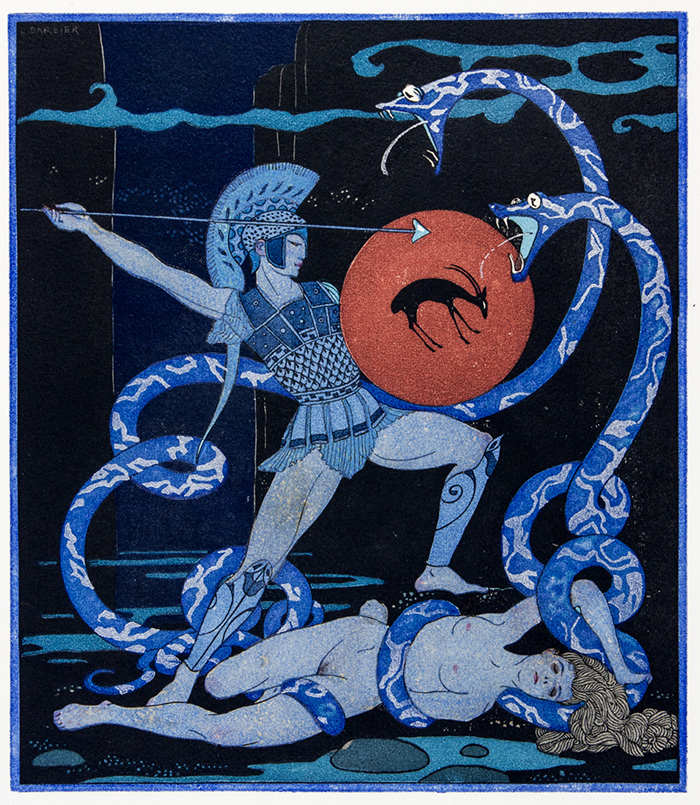 Coppia di xilografie colorate a pochoir. mm 300x240 cad. Tratti da Pierre Loüys, Les chansons de Bilitis traduit du grec. Illustrations de G. Barbier gravées sur bois par L. F. Schmied. Paris : Collection Pierre Corrard, 1922. (2)