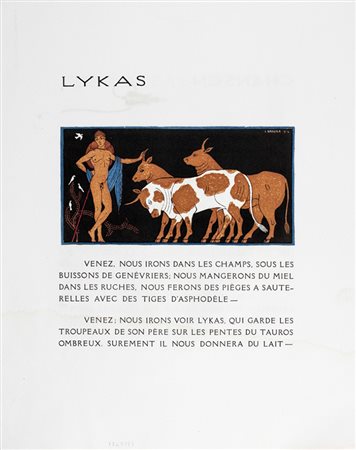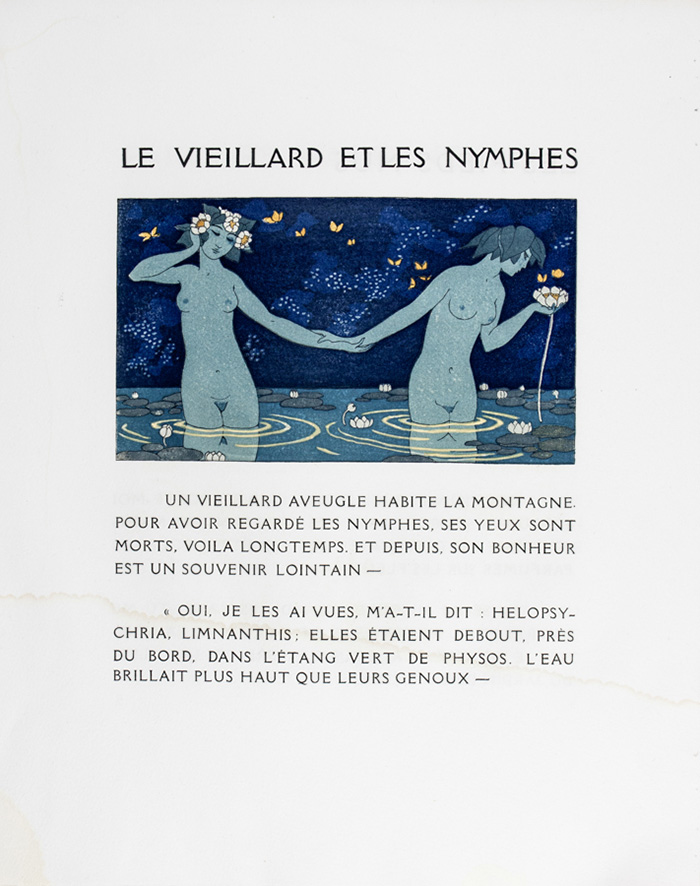 Xilografie colorate a pochoir (stampate su bifoli). mm 300x240 cad. Tratti da Pierre Loüys, Les chansons de Bilitis traduit du grec. Illustrations de G. Barbier gravées sur bois par L. F. Schmied. Paris : Collection Pierre Corrard, 1922. (5)