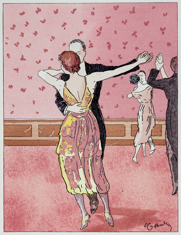 Incisione colorata a pochoir. mm 300x150. Foglio: mm 380x245. Dalla "Gazette du Bon Ton", marzo 1920, tav. 9. Giuliano Ercoli, Il pochoir art déco, Firenze, 1987, tav. LXXII, p. 83. Si aggiunge: Leonetto Cappiello, Coppie danzanti. Incisione colorata a pochoir. mm 200x150. Foglio: 290x220. Parzialmente applicata a passe partout. (2)