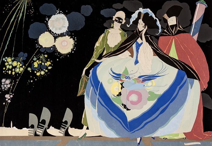 Incisione colorata a pochoir. mm 381x509. Foglio: mm 500x650. Ercoli, 53. Firmata a matita e firmata sulla lastra in basso a destra. In alto a sinistra: “Publié par L'Estampe Moderne 14, rue de Richelieu Paris 1926”. Un acquerello dello stesso soggetto fu esposto alla Biennale di Venezia nel 1922.
