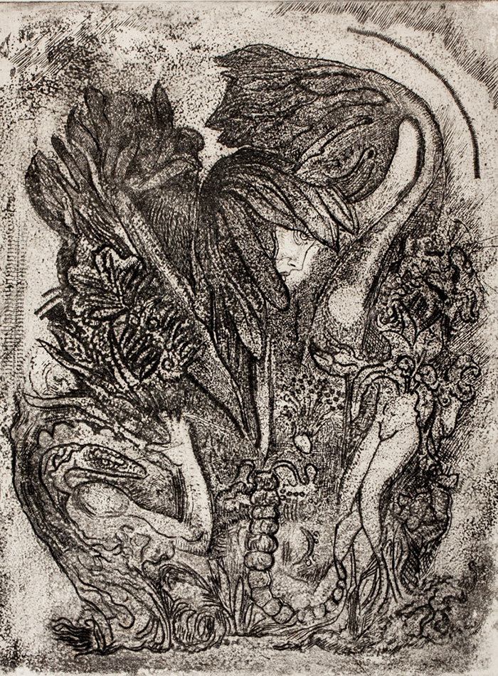 Vernice molle, acquaforte e rotella. mm 240x178. Foglio: mm 378x265. Quesada 1978 n. 116; Bardazzi 2002, n. 83. Titolata e firmata a matita in basso ai lati. L'incisione è nota anche con i titoli La congrega dei perfidi vegetali e Incantesimo botanico - l'archetipo dei perfidi vegetali. Una delle più famose incisioni dell'Arista, intrisa di morboso erotismo.