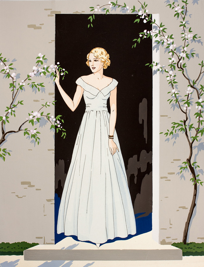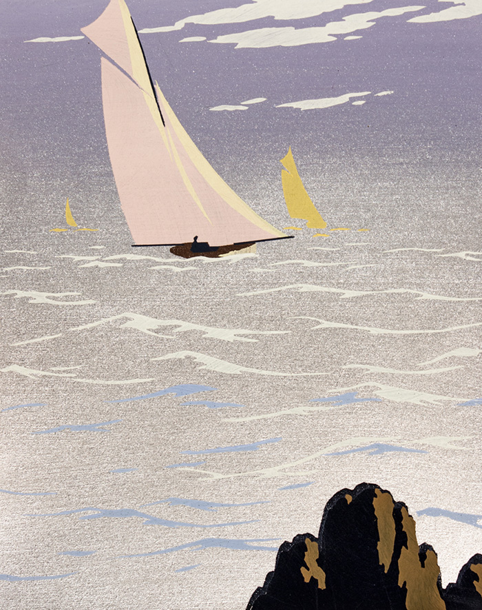 1) Sciatrice. Incisione colorata a pochoir e argento. mm 307x210. 2) Figura femminile sulla porta. Incisione colorata a pochoir. mm 305x235. 3) Barche a vela. Incisione a pochoir, argento. mm 170x135. Foglio: mm 345x248. (3)