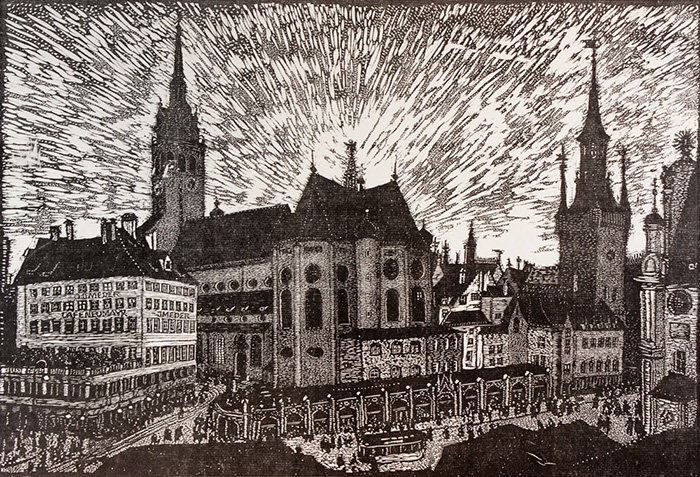 Algrafia a colori. mm 305x395. Foglio: mm 450x560. Firmata nella lastra in alto a destra. Si aggiunge: Emma Bormann. Petersberg in München. 1920. Xilografia. mm 340x500. Foglio: mm 450x560. Entrambe edite da Verlag der Gesellschaft für vervielfältigende Kunst, Wien. (2)