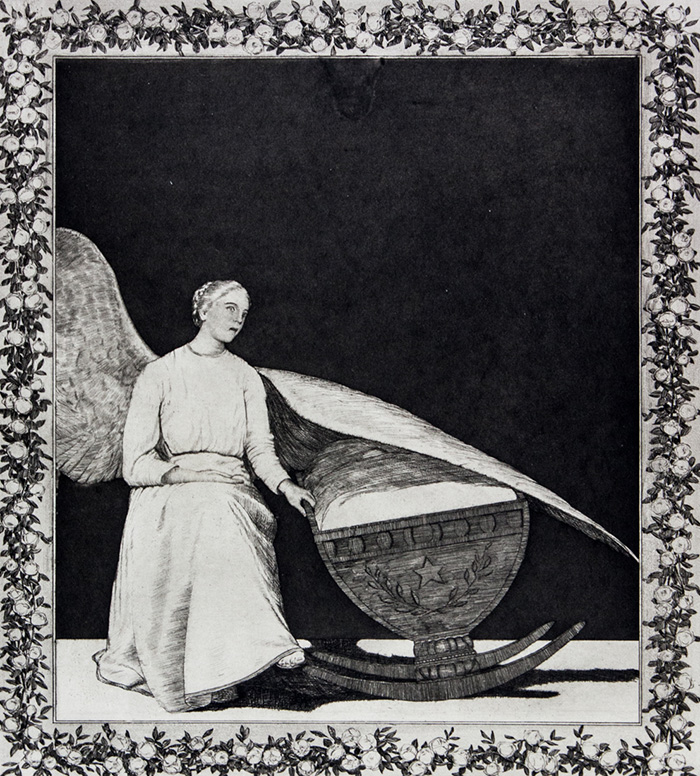 Acquaforte. mm 385x340. Foglio: mm 575x410. In basso al centro stampati i versi "Dir ist die Erde noch verschlossen, / Du hast noch keine Lust genossen,/Noch ist kein /Glück, was du empfingst; /Wie könntest du so süß denn träumen,/Wenn du nicht noch in jenen Räumen,/Woher du kamest, dich ergingst?" di Christian Frederick Hebbel (Auf ein schlummerndes Kind, Su un bambino addormentato). Rara.